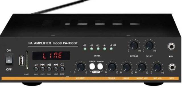 Підсилювач AMP PA-333BT обладнаний роз'ємами для під'єднання USB і SD-карт, що дає змогу відтворювати музичні файли у форматі MP3. Він також підтримує Bluetooth, забезпечуючи бездротове відтворення музики зі смартфонів та інших пристроїв. Підсилювач має два мікрофонні входи, які дають змогу під'єднувати як дротові, так і бездротові мікрофони.