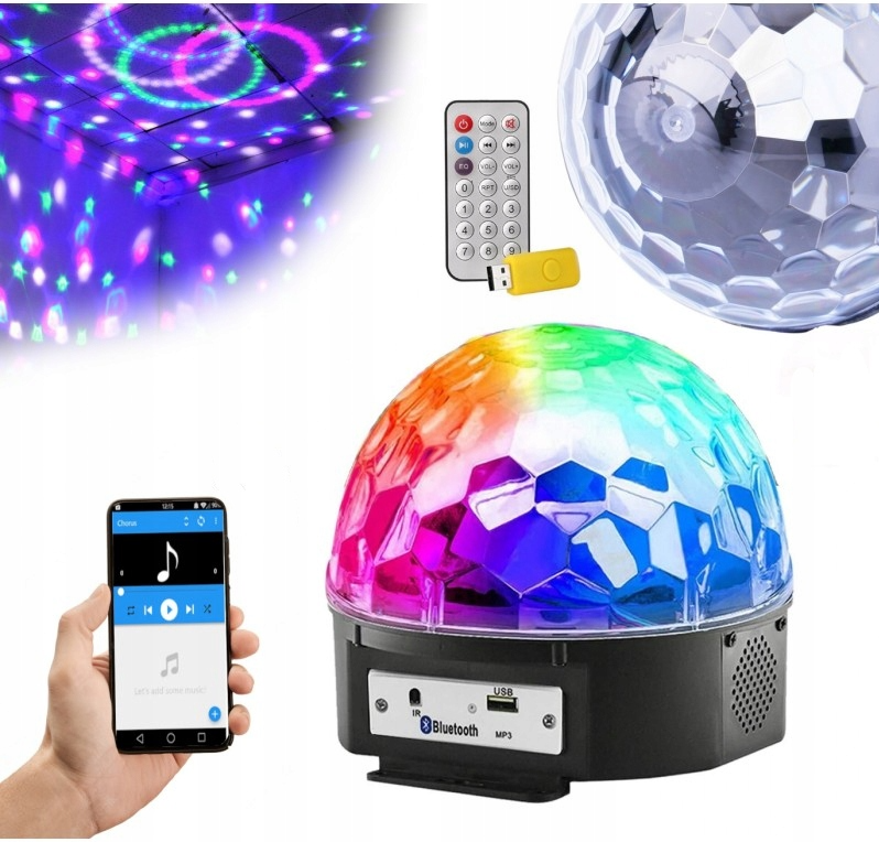Зустрічайте новинку — Музичний мініпроєктор для вечірок LED Crystal magic ball light MP3! Цей унікальний мініпроєктор підтримує програвання музики у форматі МР3. Є вхід для USB-флешки, а також Bluetooth.